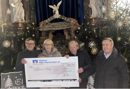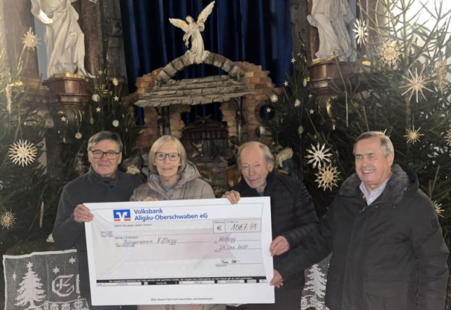 Spendenübergabe vor der Krippe in der Wolfegger Pfarrkirche. Unser Bild zeigt von links nach rechts: