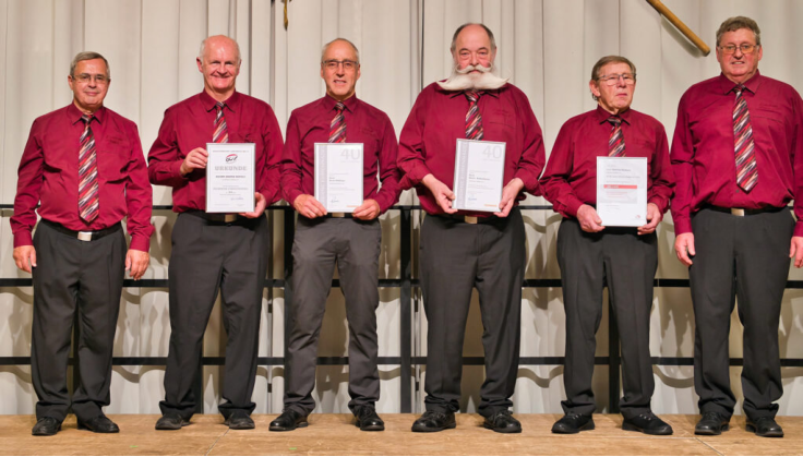 Ehrungen beim Männerchor Alttann 9.11.2024 Alttann - Die diesjährigen Sängerabende standen unter dem Motto: „Uns Männer mag man eben“. Im Rahmen dieser Konzerte wurden langjährige Sänger von Herrn Bielau aus Wilhelmsdorf, Vizepräsident des Oberschwäbischen Chorverbandes (OCV), geehrt. Er hat diese Aufgabe souverän gemeistert. Er würdigte jeden Geehrten mit ein paar Sätzen über das jeweils Geleistete. Durch die Kürze seiner Ansprache erhielt er die volle Aufmerksamkeit des Publikums. Ehrungen für langjähriges Singen: Bruno Häfele für 30 Jahre aktives Singen: Silberne Ehrennadel vom Oberschwäbischen Chorverband Er trat 1994 in den Chor ein und singt im I. Bass. 1999 hat er unseren Internetauftritt eingerichtet und pflegt ihn seither regelmäßig. Er sorgt für Pressebilder, Tonträger und Aufnahmen von Auftritten. Daneben hilft er bei allen anderen Aktivitäten des Chores. Bruno Waldinger für 40 Jahre aktives Singen: Silberne Ehrennadel Schwäbischer Chorverband Er trat im April 2022 in unseren Chor ein und singt im I. Tenor. Zuvor sang er von 1975 bis 1995 im Kirchenchor St. Christina Ravensburg und von 1999 bis 2021 im Kirchenchor in Unterankenreute. Im Juli dieses Jahres übernahm er das Amt des Kassiers in unserem Verein. Aktiv beteiligt er sich bei jeder Gelegenheit. Martin Rothenhäusler für 40 Jahres aktives Singen: Silberne Ehrennadel Schwäbischer Chorverband Er trat 1974 in den Chor ein. Aus beruflichen Gründen setzte er von 1984 bis Ende 1995 aus. Er singt im II. Bass. Durch seinen markanten Bart ist er im Chor nicht zu übersehen. Matthias Wadasch für 50 Jahre aktives Singen: Ehrenzeichen in Gold vom Deutschen Chorverband 1974 trat er in den Chor ein und singt seither im II. Tenor. Daneben war er von 1980 bis 2021 den Notenwarten behilflich oder hat sie vertreten. Auch als Helfer bei den Bühnenaufbauten war er in den zurückliegenden Jahren tätig und bei allen anderen Vereinsaktivitäten ist er ohne viel Aufhebens zur Stelle. Karl Motz, Vorsitzender des Männerchors, überreichte den Geehrten ein Weingeschenk. Er dankte ihnen nochmals für ihr langjähriges Singen und für ihre Mitarbeit im Verein. Ebenso bedankte er sich bei Herrn Bielau für die Vornahme der Ehrungen.    Ehrende und Geehrte (mit Urkunde). Unser Bild zeigt (von links): Karl Motz, Bruno Häfele, Bruno Waldinger Martin Rothenhäusler, Matthias Wadasch und Dieter Hoh (Stellvertretender Vorsitzender des Männerchores / Liederkranzes). Foto: Kurt Nußbaumer. NU